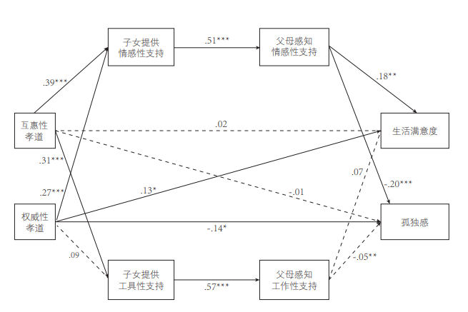 在中介模型中,子女的权威性孝道信念对父母的生活满意度和孤独感仍然具有直接的预测作用。随着社会的变迁,孝道的观念也在不断的发生变化。不同的时代对孝道有不同的理解。与年轻人相比,权威性孝道相较于互惠性孝道而言,更符合老年人对孝道的期望。权威性孝道也与中国传统文化中要求子女必须绝对服从父亲的观念相一致。遵从权威性孝道的子女,会更倾向于压抑或者牺牲自己的需求,以遵从父母的愿望。权威性孝道信念对于父母生活满意度和孤独感的预测表明,从父母的角度,他们更看重子女对他们的尊重和服从,这可能与老一辈们接受更多的传统教育、秉持的传统观念有关。然而在新的环境下,受到西方个人主义思潮影响的年轻人,更多地开始强调个体独立与自由思想,与传统孝道观念有很大不同。但作为子女,在合理范围内,更多的顺从可能会给父母带来更多的幸福感,也使得家庭关系更加融洽。如此一来,适当的妥协,也不失为一种生活的艺术。